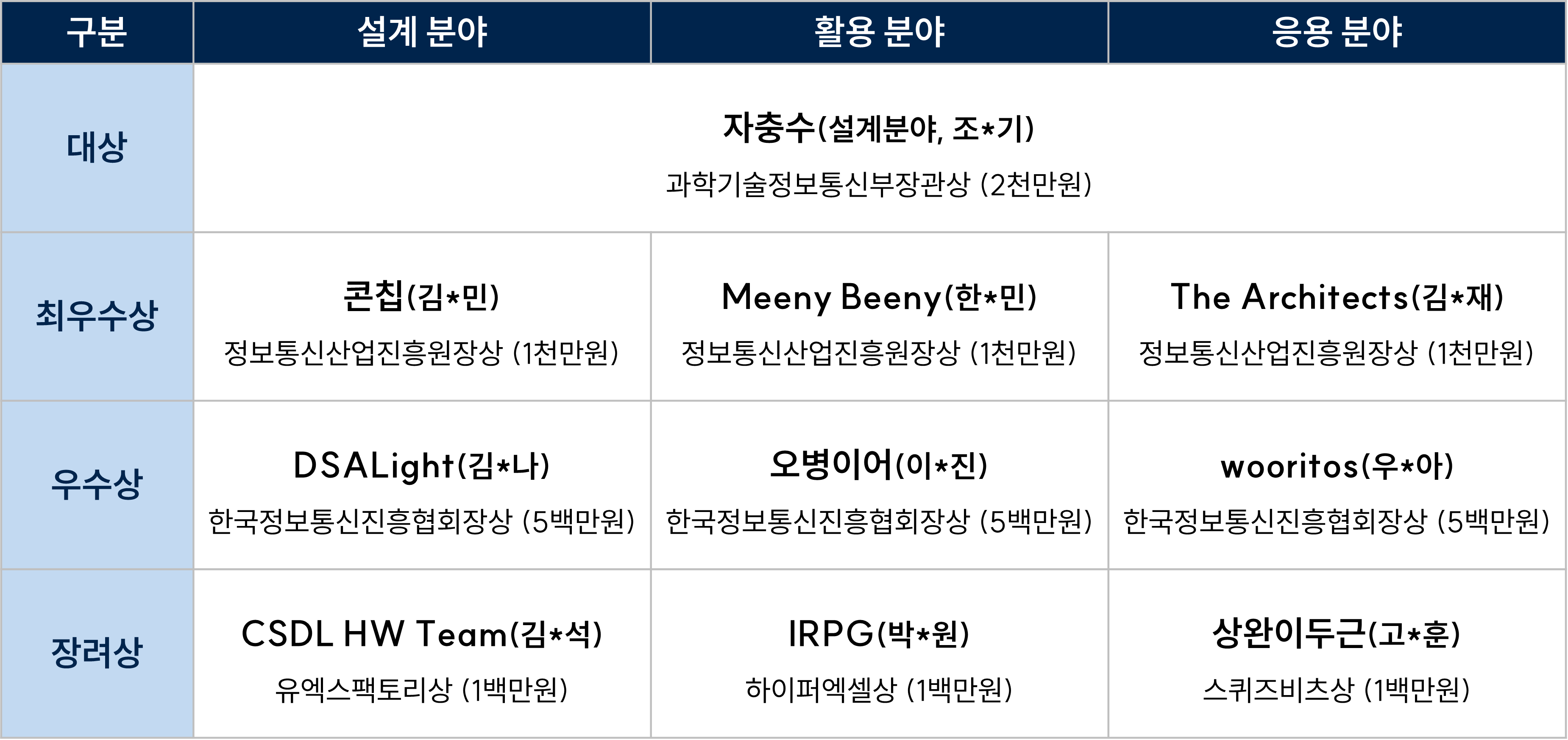 최종 발표평가 및 운영위원회 심사를 통해 아래와 같이 분야별 최종 수상팀이 선정되었습니다.